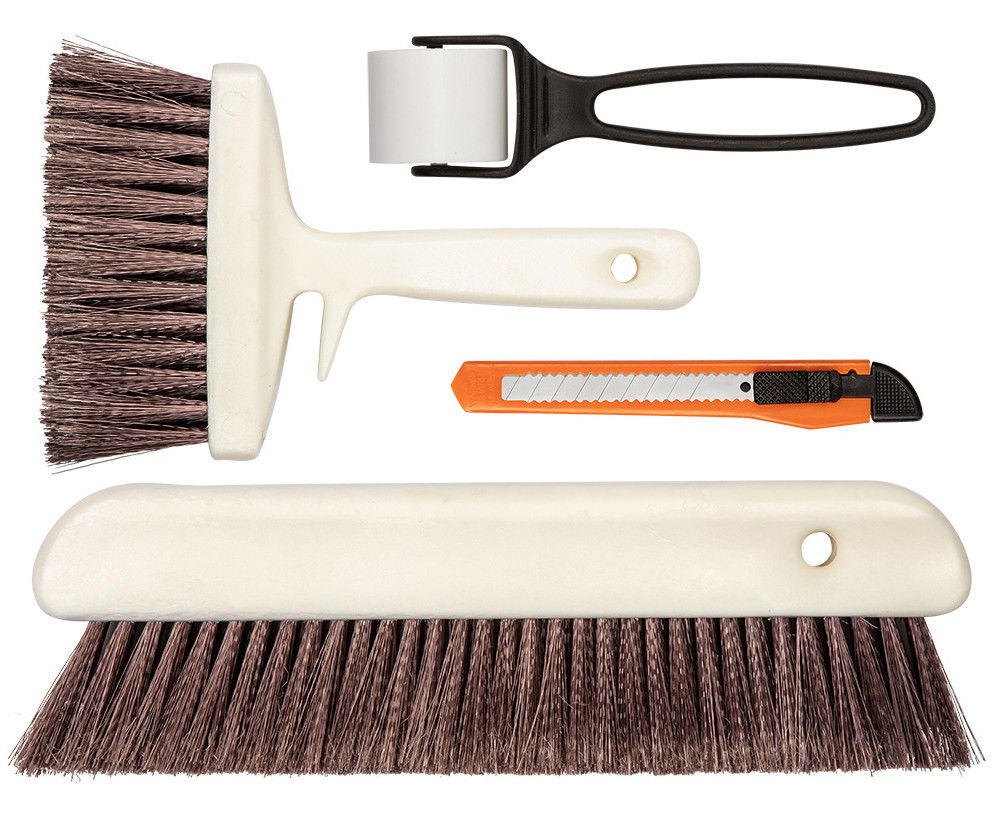 Tartalmaz egy ragasztó felvitelére alkalmas ecsetet, egy tapétasimító kefét, amellyel eltávolítható a levegő és a felesleges ragasztó a tapéta alól, egy simító hengert és egy tapétavágó kést.